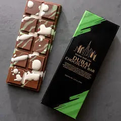 Savor the taste of our Dubai Bar, crafted for those who enjoy a delicious treat without the luxury price tag. Each milk chocolate bar is filled with a delightful mix of creamy pistachio butter and crunchy goodness, bringing you rich flavor with every bite.